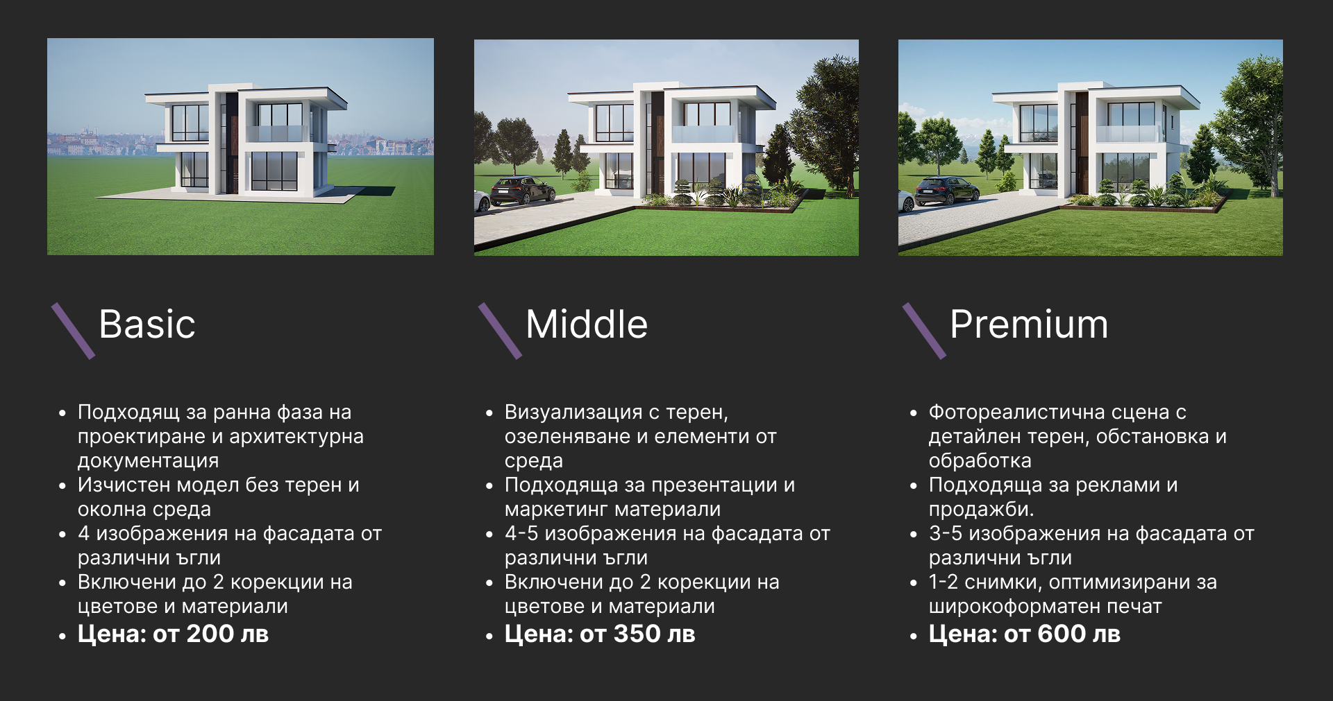 Предлагат се няколко нива на визуализация – от базови рендъри до напълно завършени изображения с терен, озеленяване и постпродукция, в зависимост от предпочитанията и нуждите на клиента.